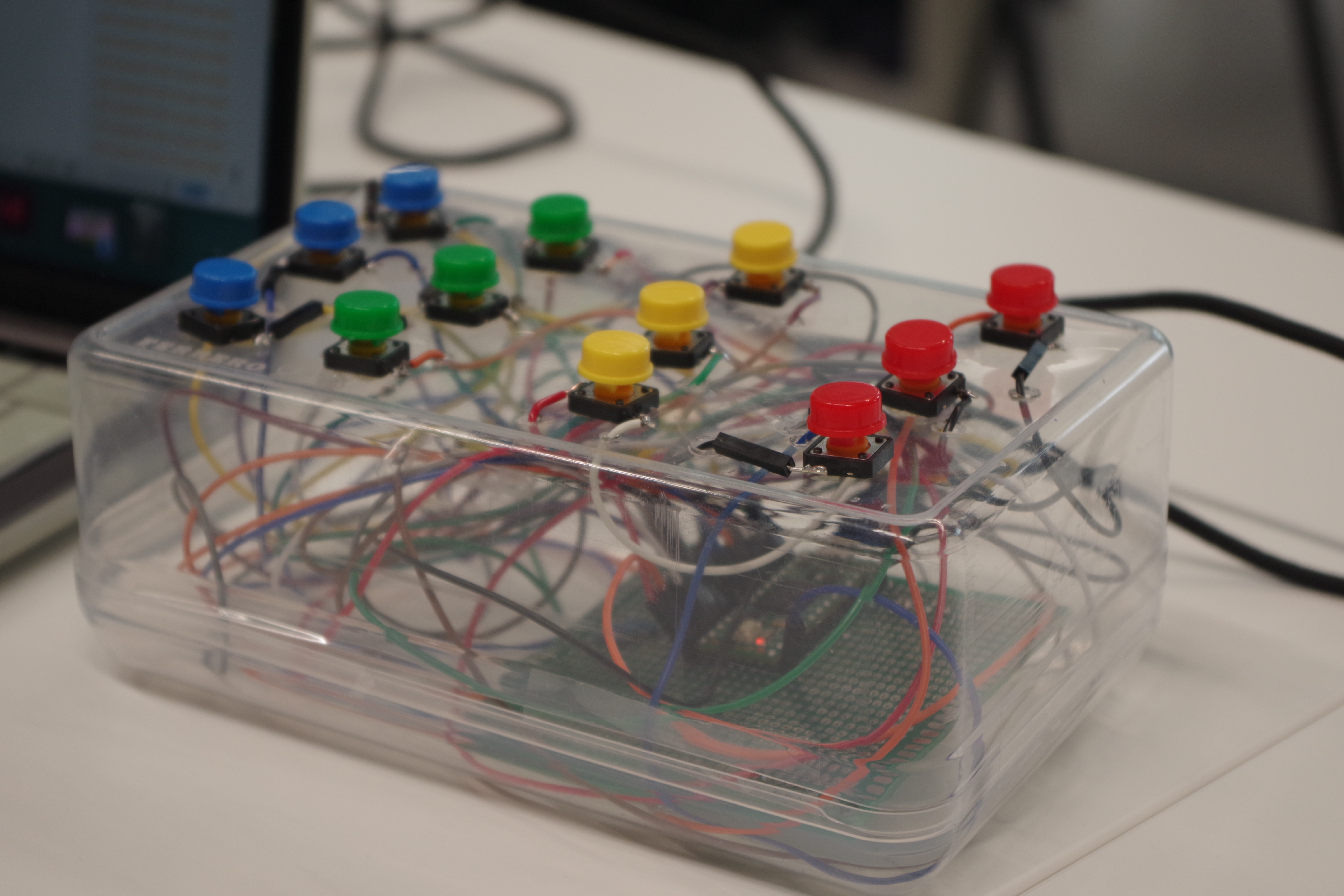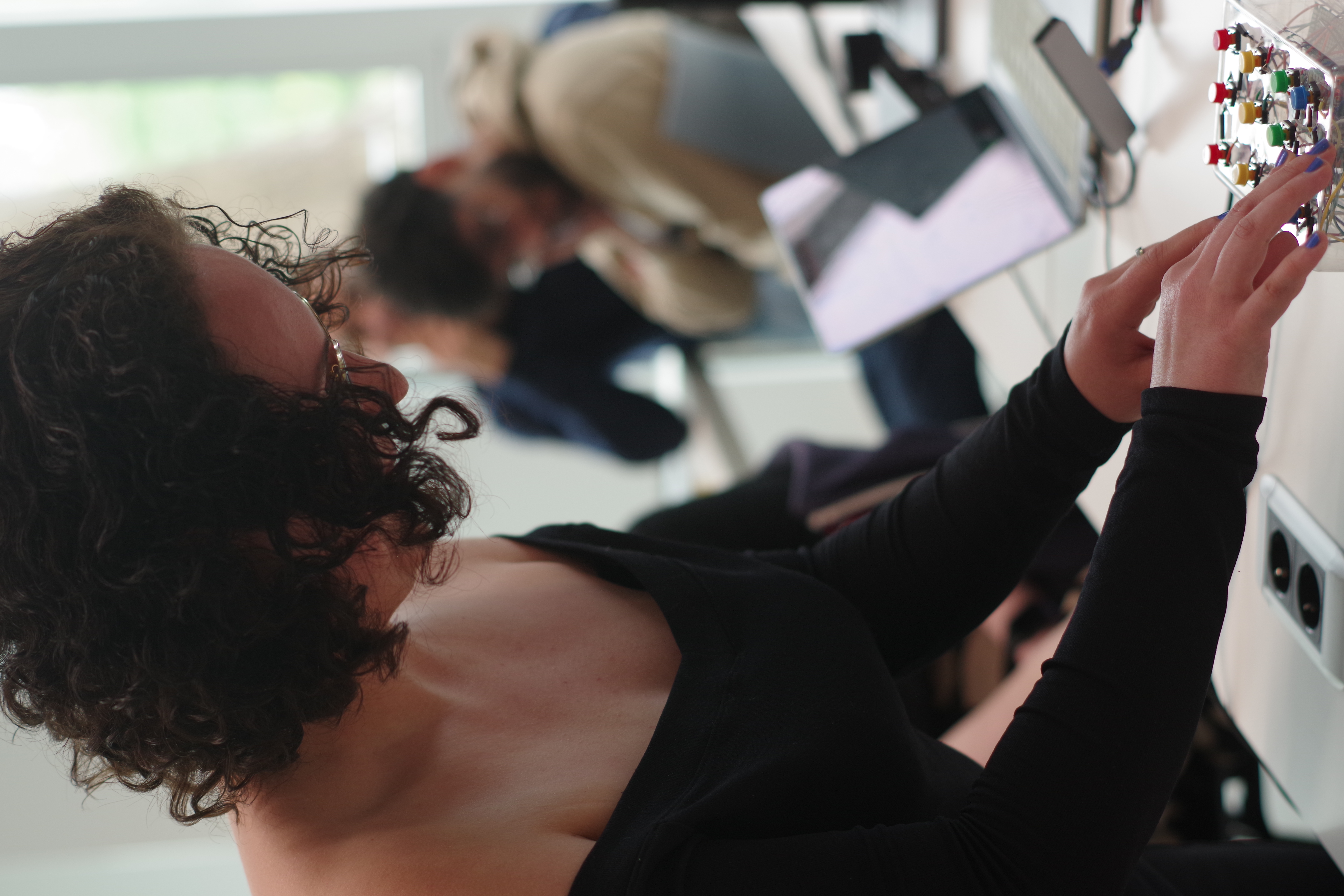 The user interacts with four rows of buttons (one per column). Pressing a button selects a sound. If the combination matches a valid musical track, the sound continues unaltered, and the user can move on. If incorrect, the system will play a ‘wrong’ sound effect and will re-scramble the sound assignments of each circle in that row, while adding a significant amount of reverb to the overall sound composition over time. This prevents elimination process attempts and reinforces attentive listening, forcing the participant to rely on memory and ear rather than logic alone, as well as their own body capacities (to not let go of the ‘right’ compositions they may have found so far).